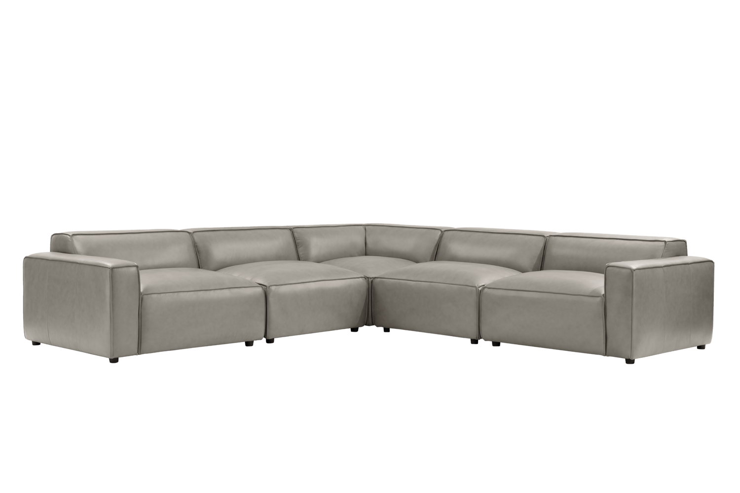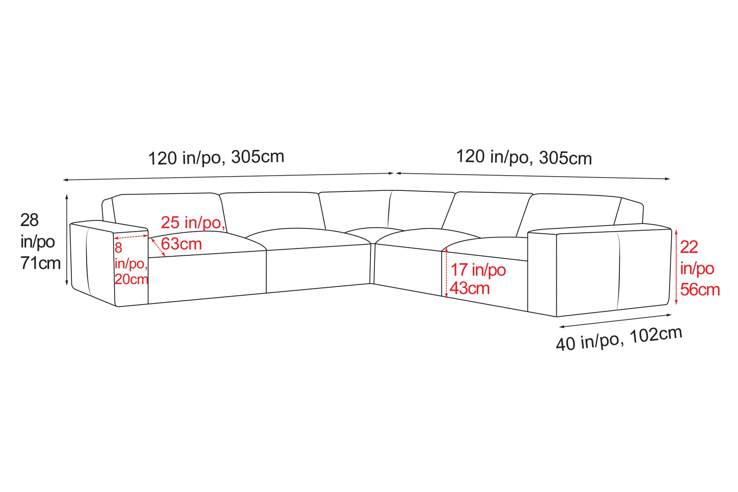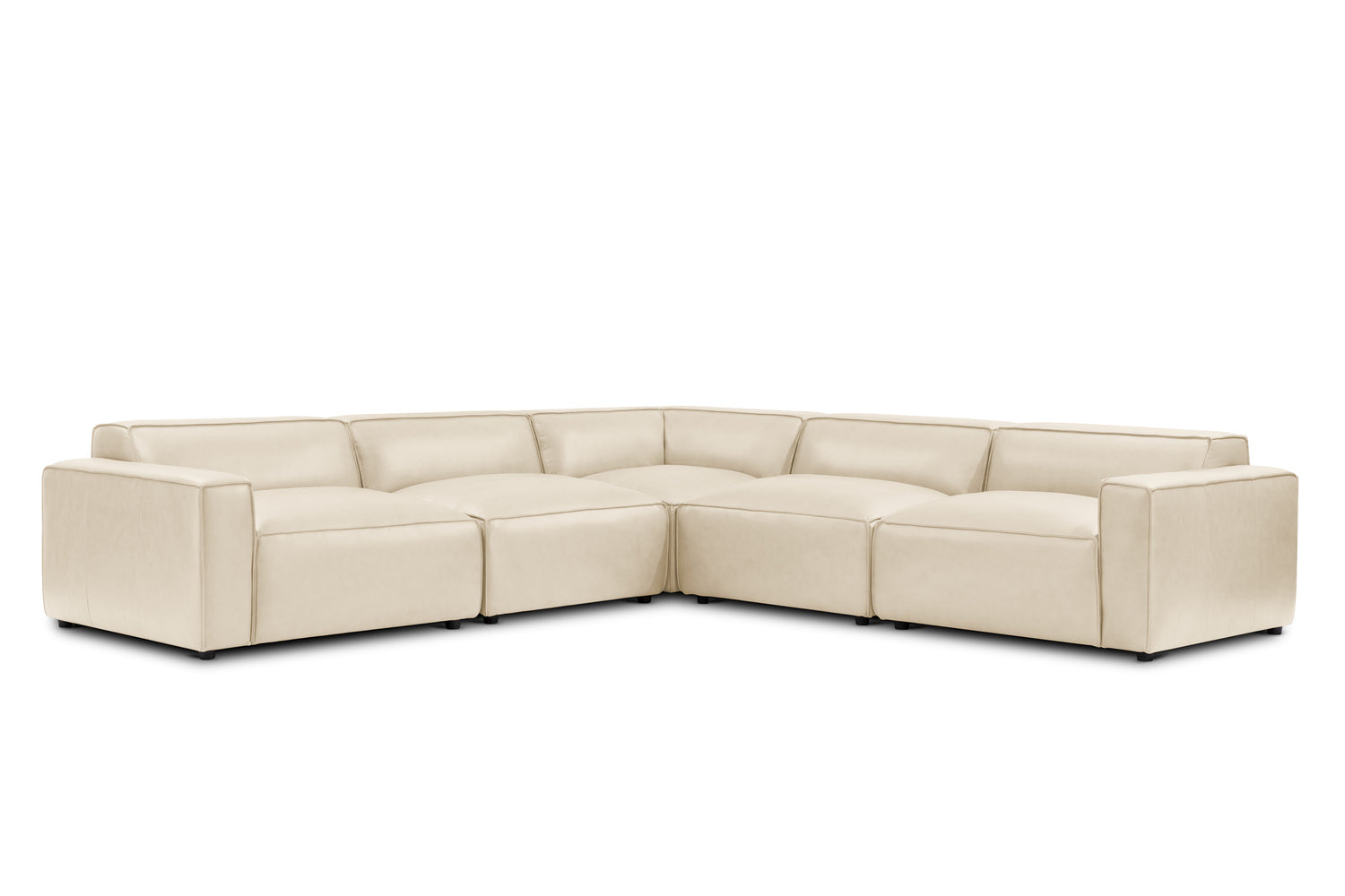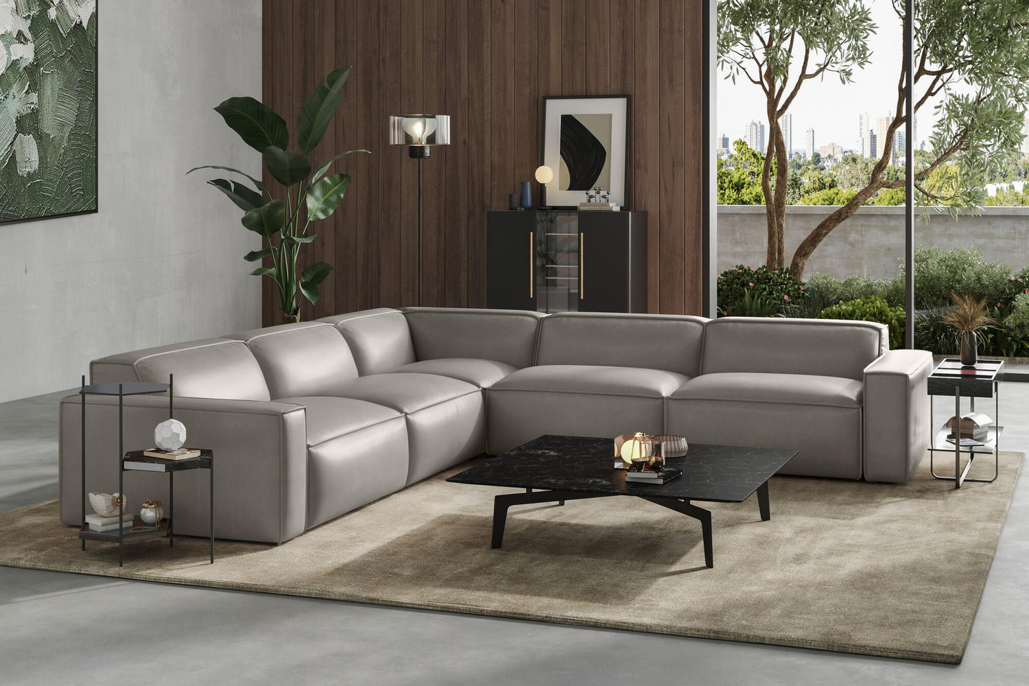 L'ensemble comprend 5 pièces individuelles et peut être configuré selon vos envies. L'assise et le dossier sont en mousse haute résilience pour un confort accru. Cet ensemble mi-ferme est doté d'une finition soignée sur tous les côtés pour préserver ses caractéristiques naturelles. Des marques et des variations de couleur sont toutefois possibles.