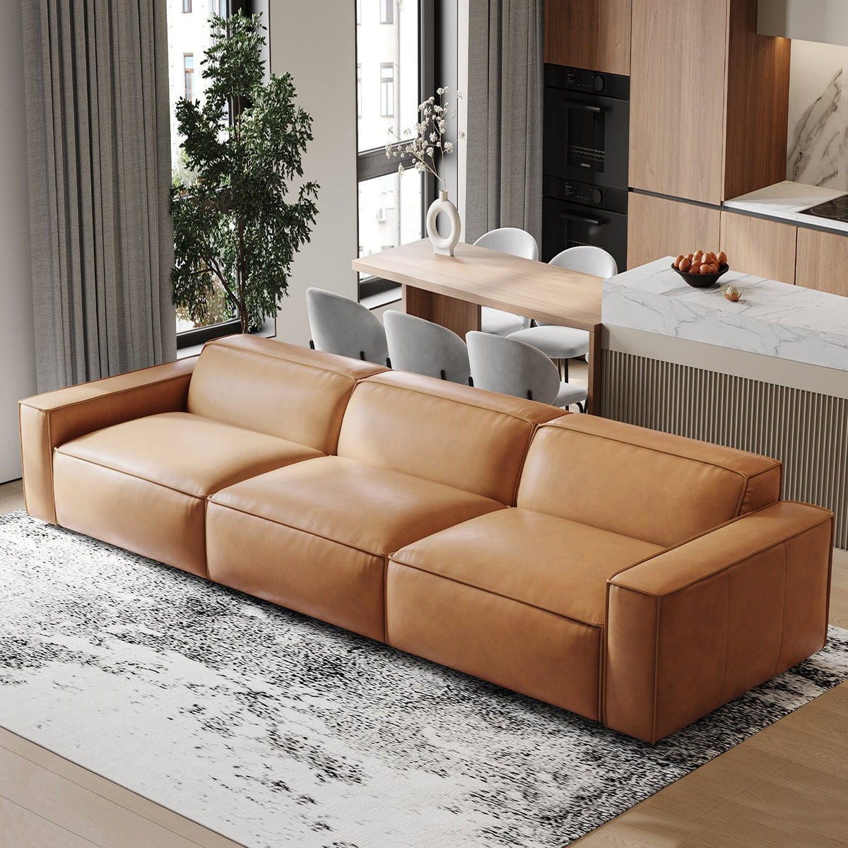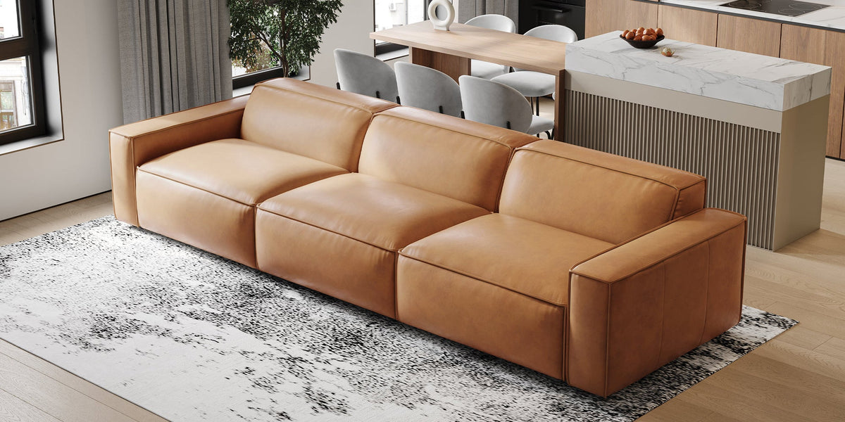 Introducing the Nathan Leather Modular Sofa set - a perfect blend of comfort and elegance. Crafted from premium full aniline leather, its classic design complements any decor. Sink into the semi-firm seats for ultimate relaxation. Built with a solid wood frame and high-resilience foam, it offers lasting durability and comfort. Customize your layout by adding pieces from the same collection. Finished on all sides to maintain its appeal, expect natural color variations and markings.