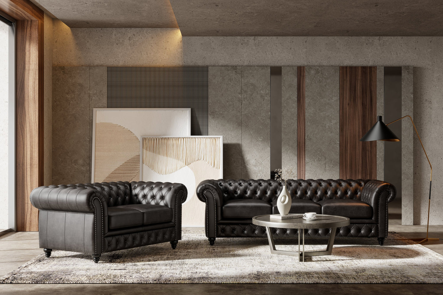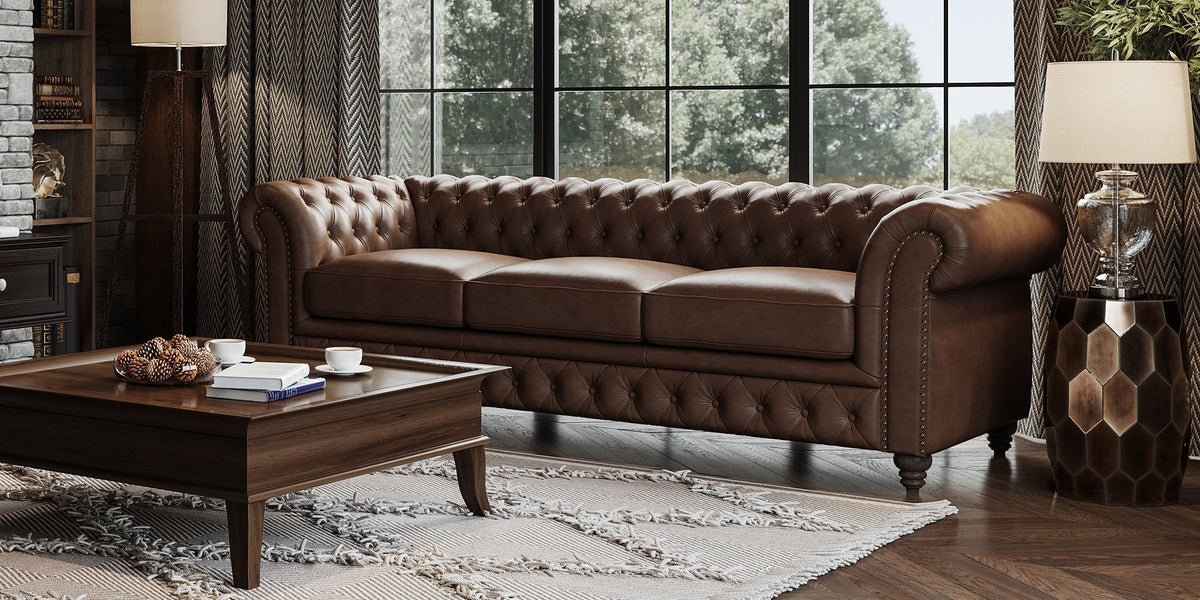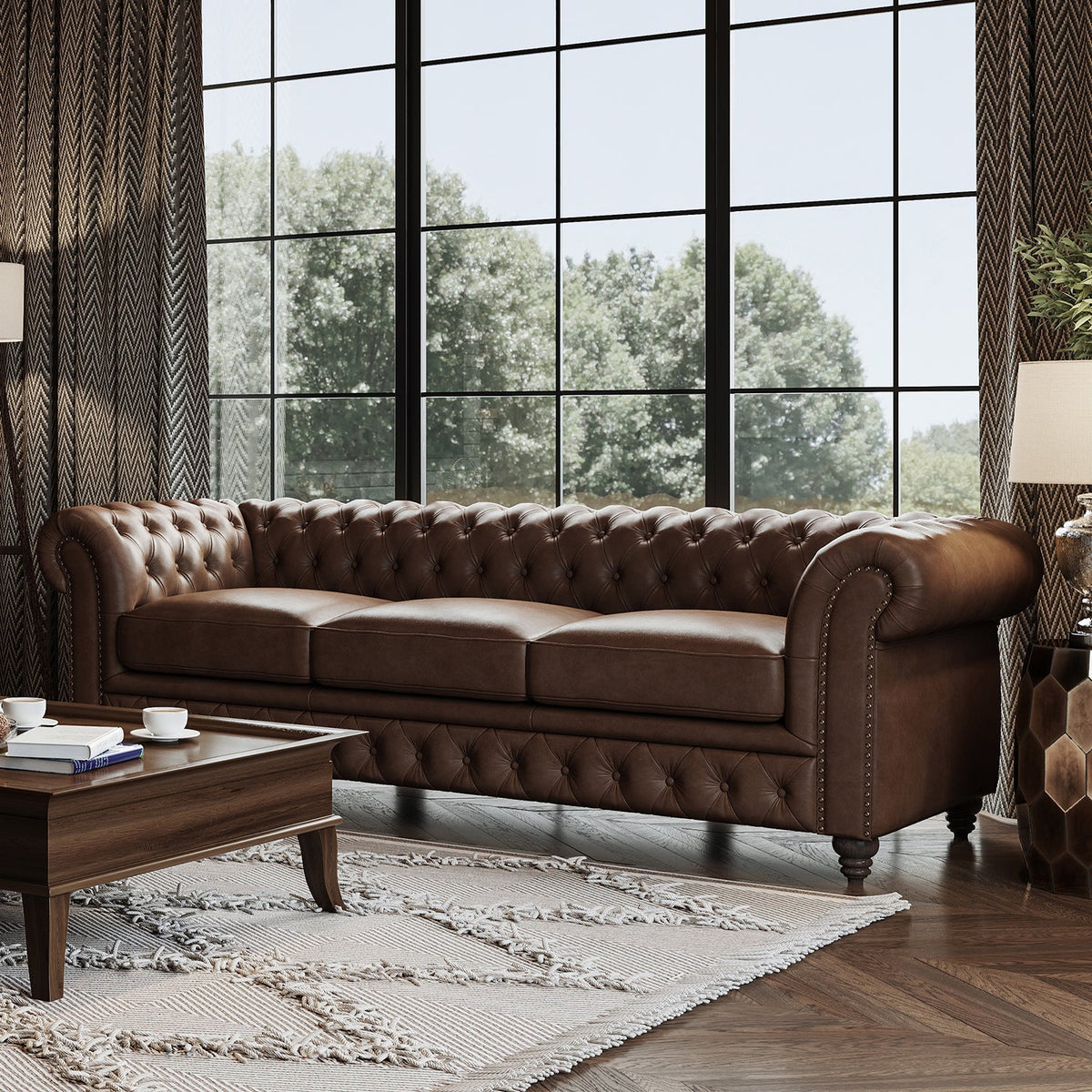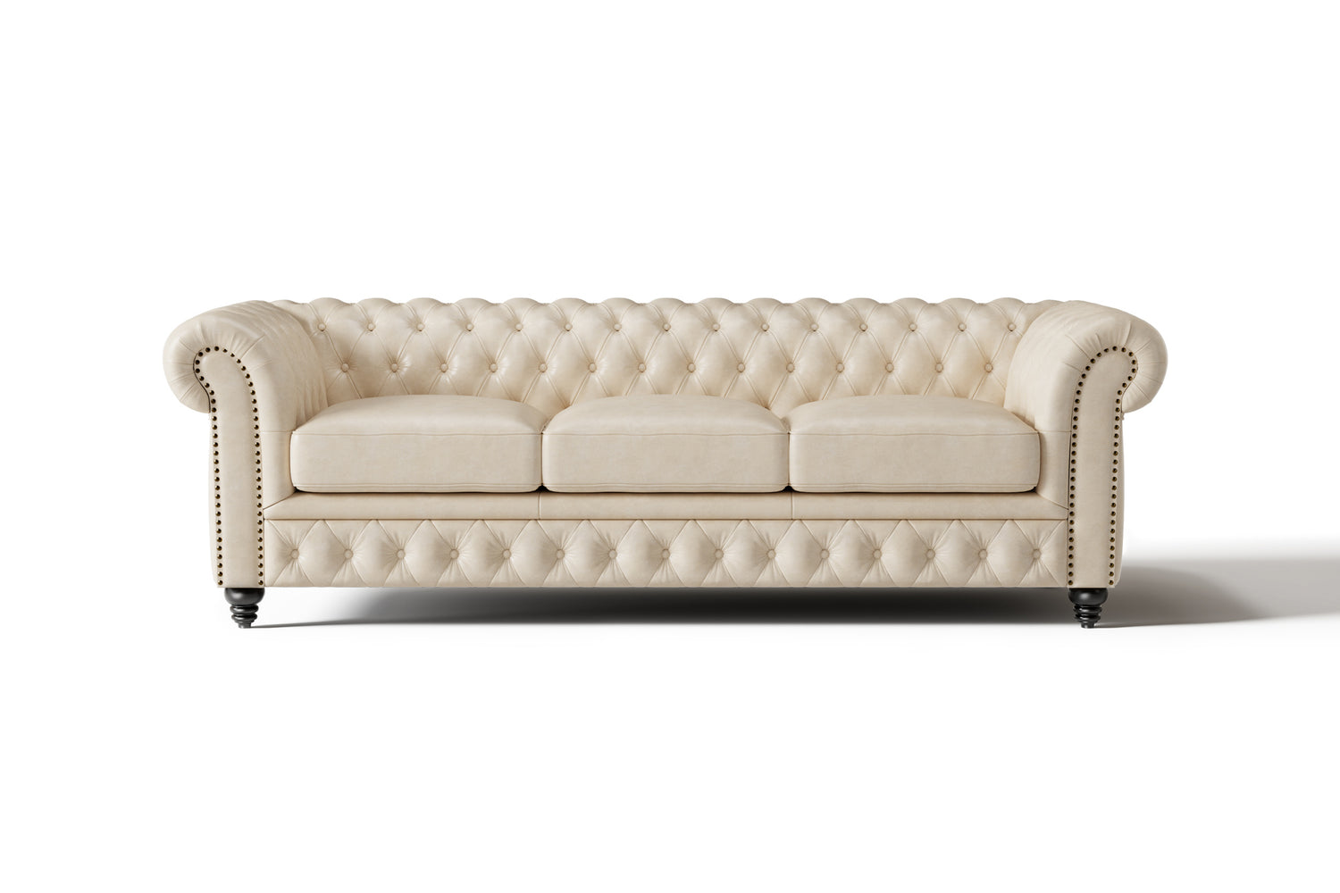 The exquisite Parma Full Aniline Leather Sofa is a true masterpiece of refined elegance. This stunning piece boasts button-tufted back cushions, beautifully accentuated by padded and tufted high-rolled arms and solid wood bun feet. The stately Bronze nail-head trim, intricately hand-applied, adds a final touch of sophistication as it outlines the arms and front rails. Immerse yourself in luxury with our grand three large-seater sofa, offering an expansive width to accommodate your every lounging desire. This Sofa exemplifies the perfect blend of exquisite craftsmanship, lasting comfort, and timeless elegance, making it an exceptional addition to your living space.