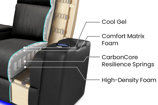- Comfort-Matrix™ Technology combines memory foam, cool gel, springs, and support foam for ergonomic comfort, keeping you cool and supported. Exclusive to 2025 Home Theatre Seating.