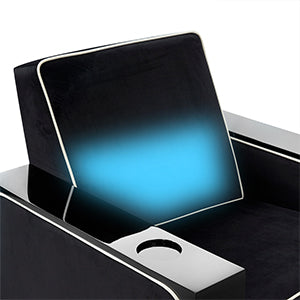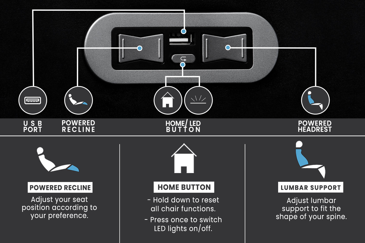 - USB Charging Port and Control Panel located on the side of the armrest.
